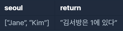 Q.String형 배열 "seoul"의 element중 "Kim"의 위치 x를 찾아, 김서방은 x에 있다는 String을 반환하는 함수, solution을 완성하세요. "seoul"에 'Kim"은 오직 한 번만 나타나며 잘못된 값이 입력되는 경우는 없습니다.