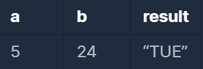 요일의 이름은 일요일부터 토요일까지 각각 SUN,MON,TUE,WED,THU,FRI,SAT입니다. 예를 들어 a=5, b=24라면 5월 24일은 화요일이므로 문자열 "TUE"를 반환하세요.