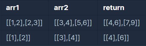 Q. 행렬의 덧셈은 행과 열의 크기가 같은 두 행렬의 같은 행, 같은 열의 값을 서로 더한 결과가 됩니다. 2개의 행렬 arr1과 arr2를 입력받아, 행렬 덧셈의 결과를 반환하는 함수, solution을 완성해주세요.