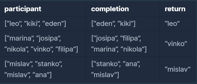 - 참가자의 이름은 1개 이상 20개 이하의 알파벳 소문자로 이루어져 있습니다.