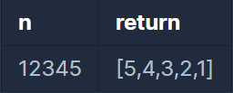 Q. 자연수 n을 뒤집어 각 자리 숫자를 원소로 가지는 배열 형태로 리턴해주세요. 예를들어 n이 12345이면 [5,4,3,2,1]을 리턴합니다.