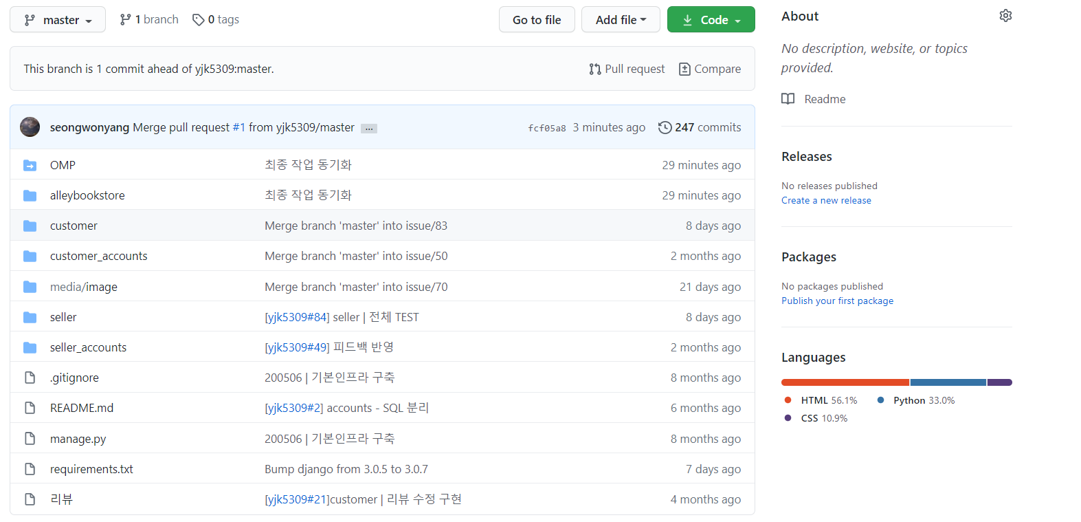 성공적으로 내 fork 저장소에 결과물들을 동기화시켰다.