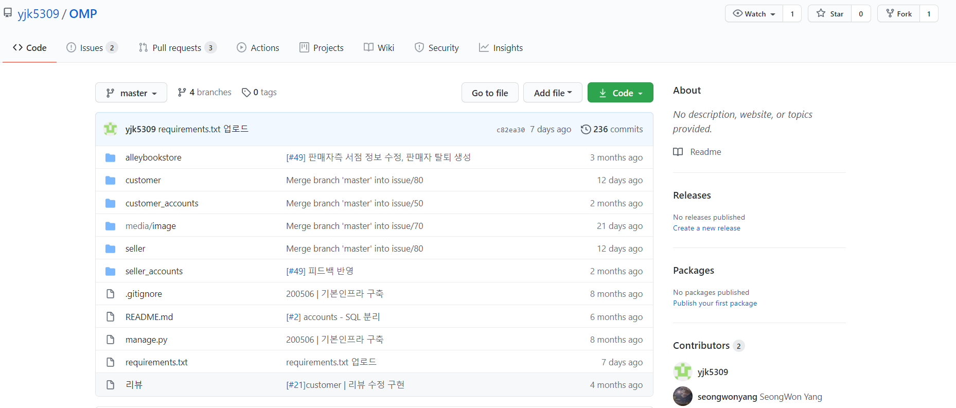 위와 같이 프로젝트 초기에만 fork를 해두어서 내 repository에는 작업이 많이 진행된 원본 repository와 달리 거의 아무것도 없는 상태이다.
