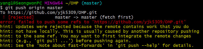 push를 하려고 하자 에러가 발생하였다. 찾아보니 원격 저장소와 로컬 저장소의 상태가 달라서 나는 오류라고 한다. 그렇기 때문에 우선 pull을 해주어 둘의 상태를 같게 해준 뒤에 push를 진행하였다.