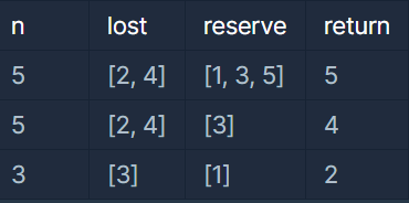 lost와 reserve에 중복되는 요소가 존재할 수 있다는 것 + lost와 reserve의 요소가 전부 같을 수도 있다는 것