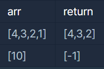 Q. 정수를 저장한 배열, arr 에서 가장 작은 수를 제거한 배열을 리턴하는 함수, solution을 완성해주세요. 단, 리턴하려는 배열이 빈 배열인 경우엔 배열에 -1을 채워 리턴하세요. 예를들어 arr이 [4,3,2,1]인 경우는 [4,3,2]를 리턴 하고, [10]면 [-1]을 리턴 합니다.