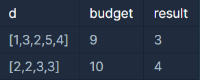 부서별로 신청한 금액이 들어있는 배열 d와 예산 budget이 매개변수로 주어질 때, 최대 몇 개의 부서에 물품을 지원할 수 있는지 return 하도록 solution 함수를 완성해주세요.