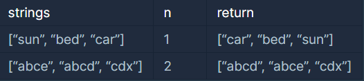 - 모든 strings의 원소의 길이는 n보다 큽니다.