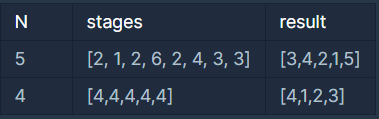 - 단, N + 1 은 마지막 스테이지(N 번째 스테이지) 까지 클리어 한 사용자를 나타낸다.