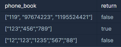 첫 번째 전화번호, “12”가 두 번째 전화번호 “123”의 접두사입니다. 따라서 답은 false입니다.