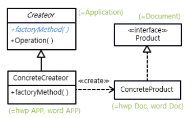 - 생성할 객체를 기술하는 책임을 자신의 서브 클래스가 지정했으면 할 때